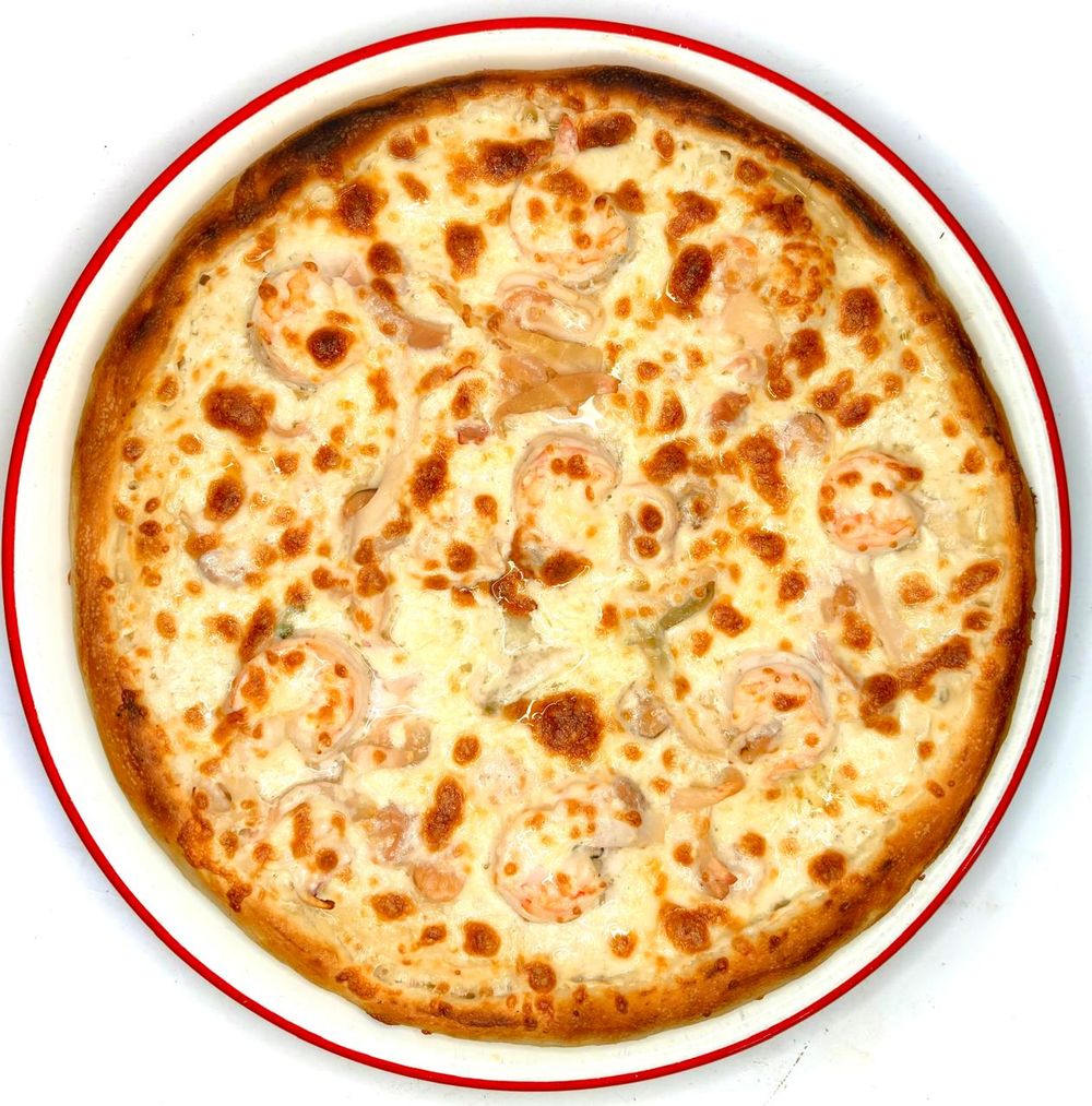 Кальмары, креветки, тигровые креветки, сыр моцарелла, соус сливочный.