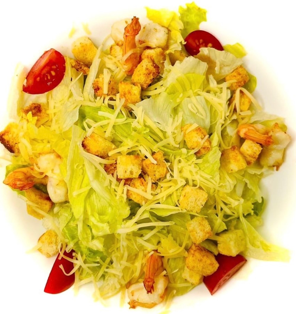 Креветки, салат айсберг, черри, пармезан, гренки, соус цезарь
