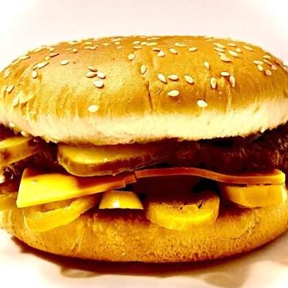 Булка с кунжутом,куриная котлета, соус Карри, айсберг,бекон(жареный),лук красный.