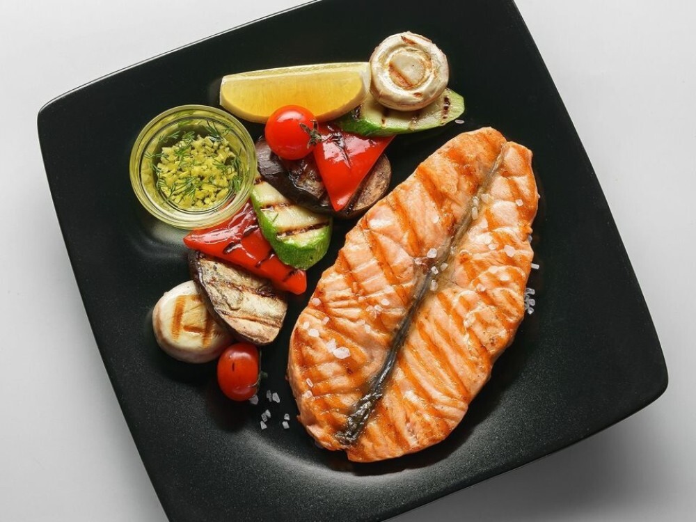 Стейк семги, баклажан, шампиньоны,цукини, перец, черри