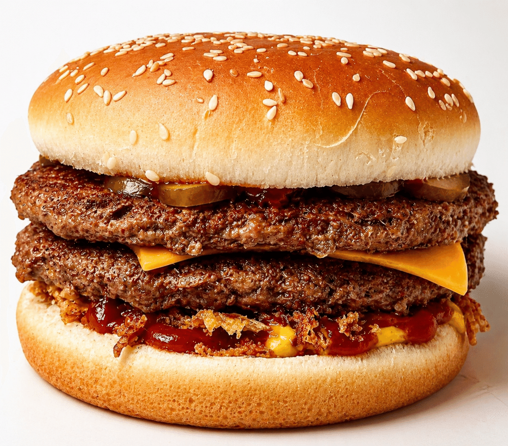 Булка с кунжутом,кетчуп - горчица,огурец(маринованный),2 котлеты(говядина)сыр чеддер,фри лук
