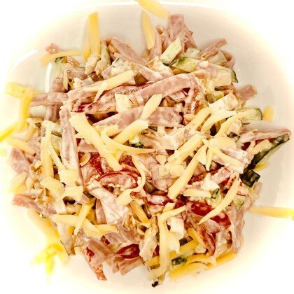 Салями,ветчина,курица,огурцы(маринованные),грибы жаренные,сметана-майонез,лук жаренный
