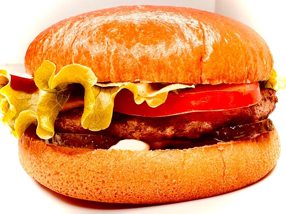 Говяжья котлета, лист салата, булочка Бриошь, сыр Чеддер, соус Барбекю, майонез, огурцы соленные, лук фри, помидор