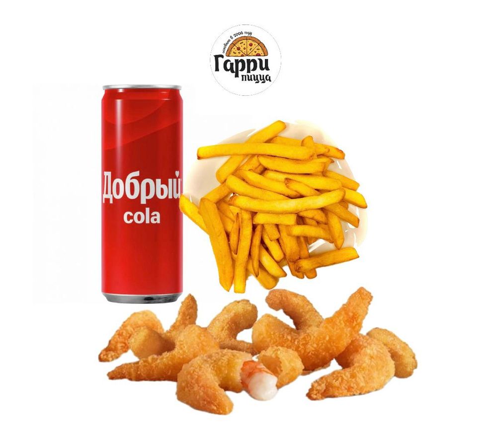 Креветки в панировке ( соус 1000 островов), фри, кола 0.33